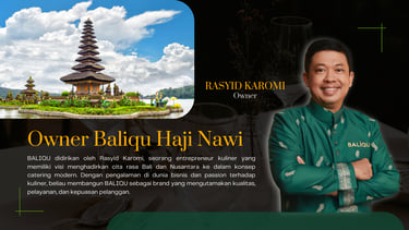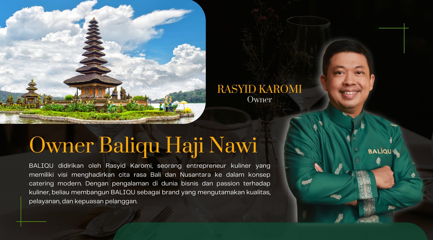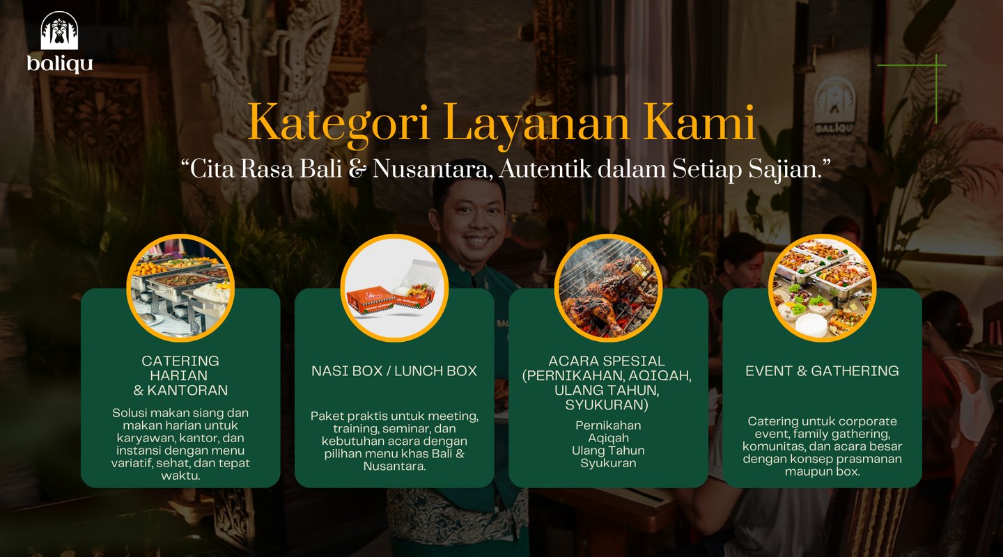 BALIQU HAJI NAWI adalah brand kuliner dan jasa catering yang menghadirkan kelezatan khas Bali dan masakan Nusantara dengan kualitas premium. Berlokasi di kawasan Haji Nawi, Jakarta Selatan, BALIQU berkomitmen menyajikan hidangan autentik, higienis, dan bercita rasa konsisten untuk kebutuhan harian hingga acara spesial.