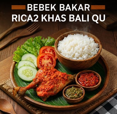 Bebek Goreng / Bakar diracik bumbu khas Bali autentik + Salada + Lalapan Dn Singkong + Mentimun + Tomat + Sambal Ijo Bali + Sambal Merah Bali